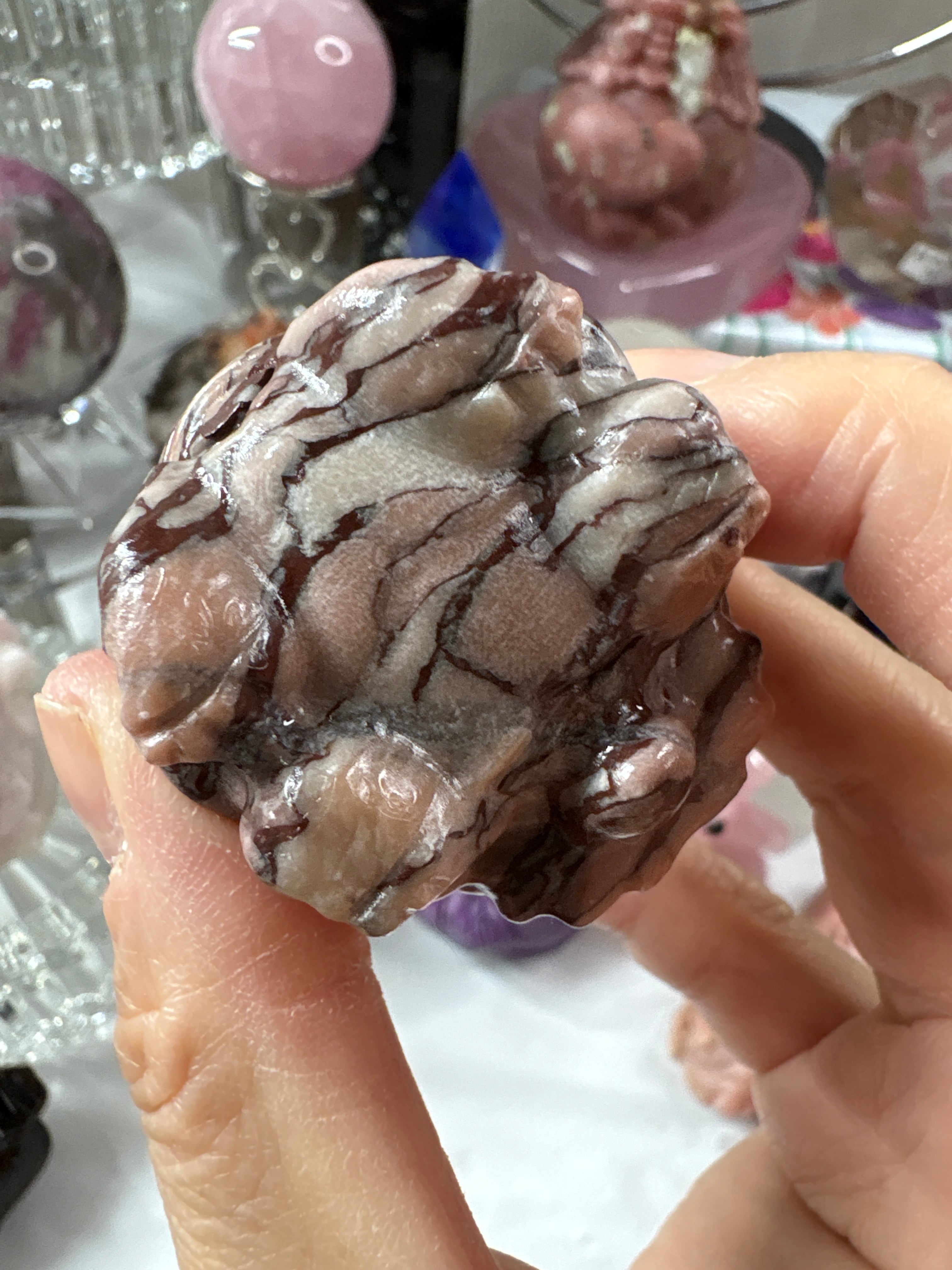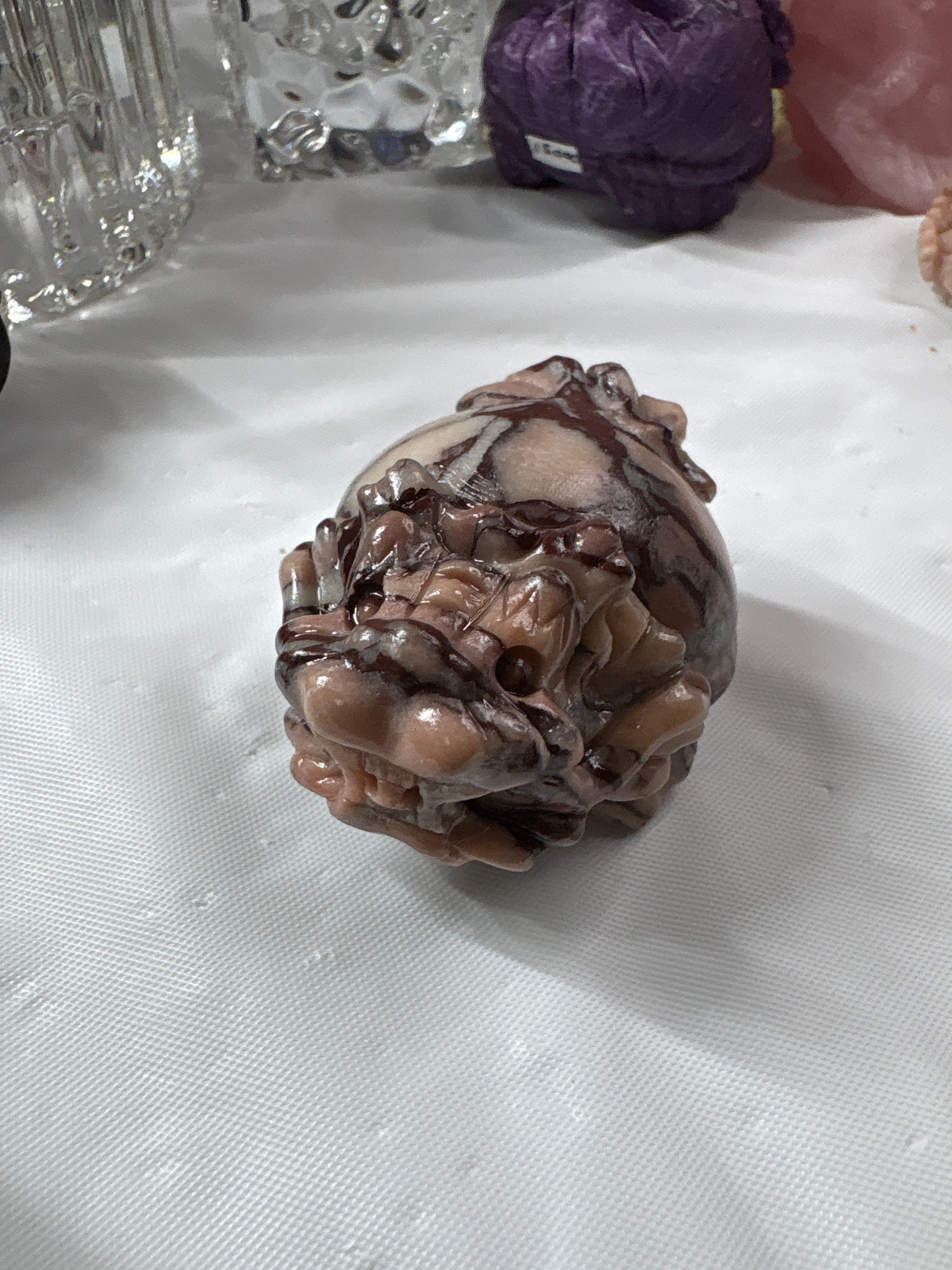 さっちゃんの目利きで選んだ、いちごミルクのような色合いが魅力の紫ゼブラストーンの龍亀です。