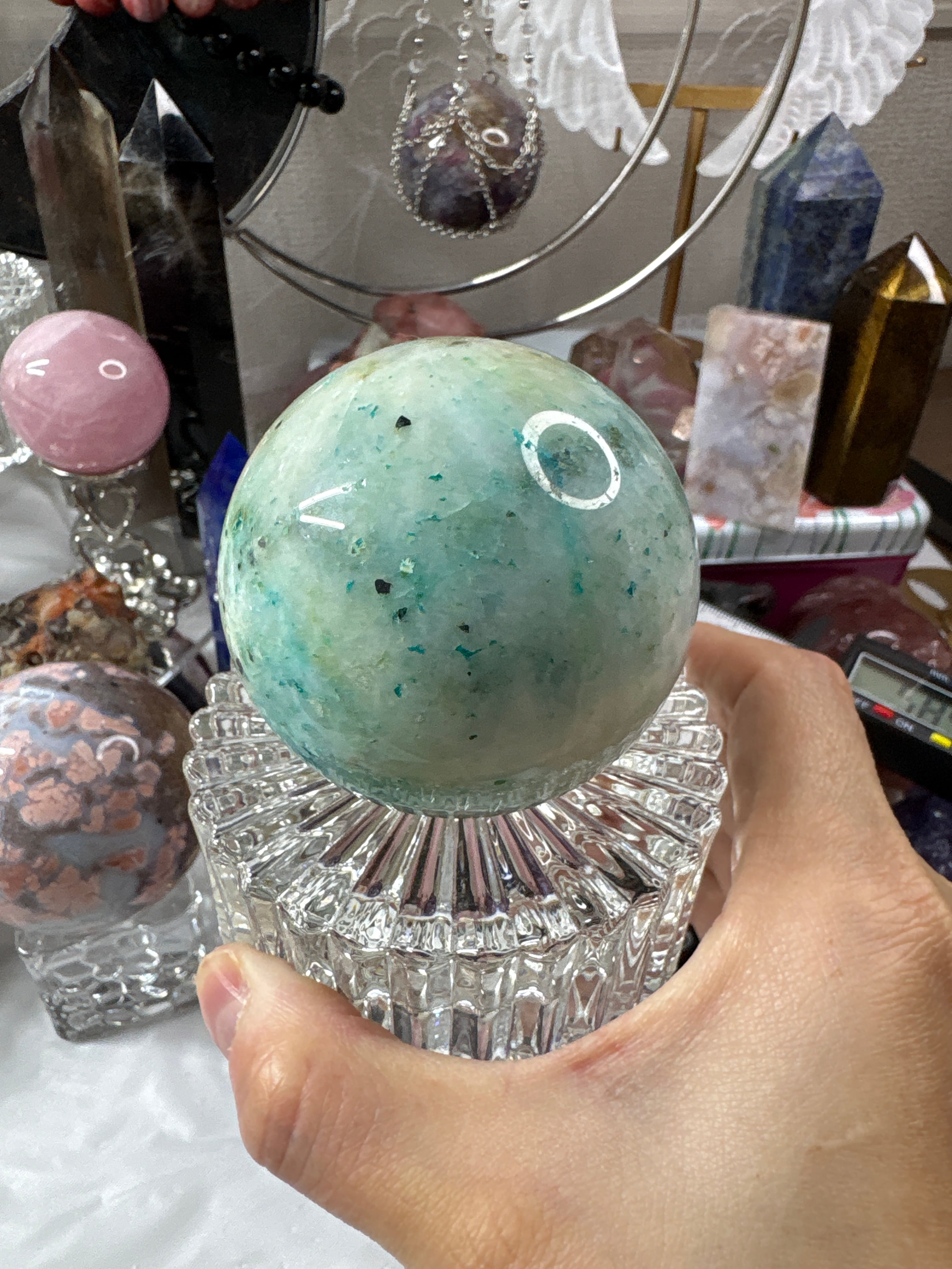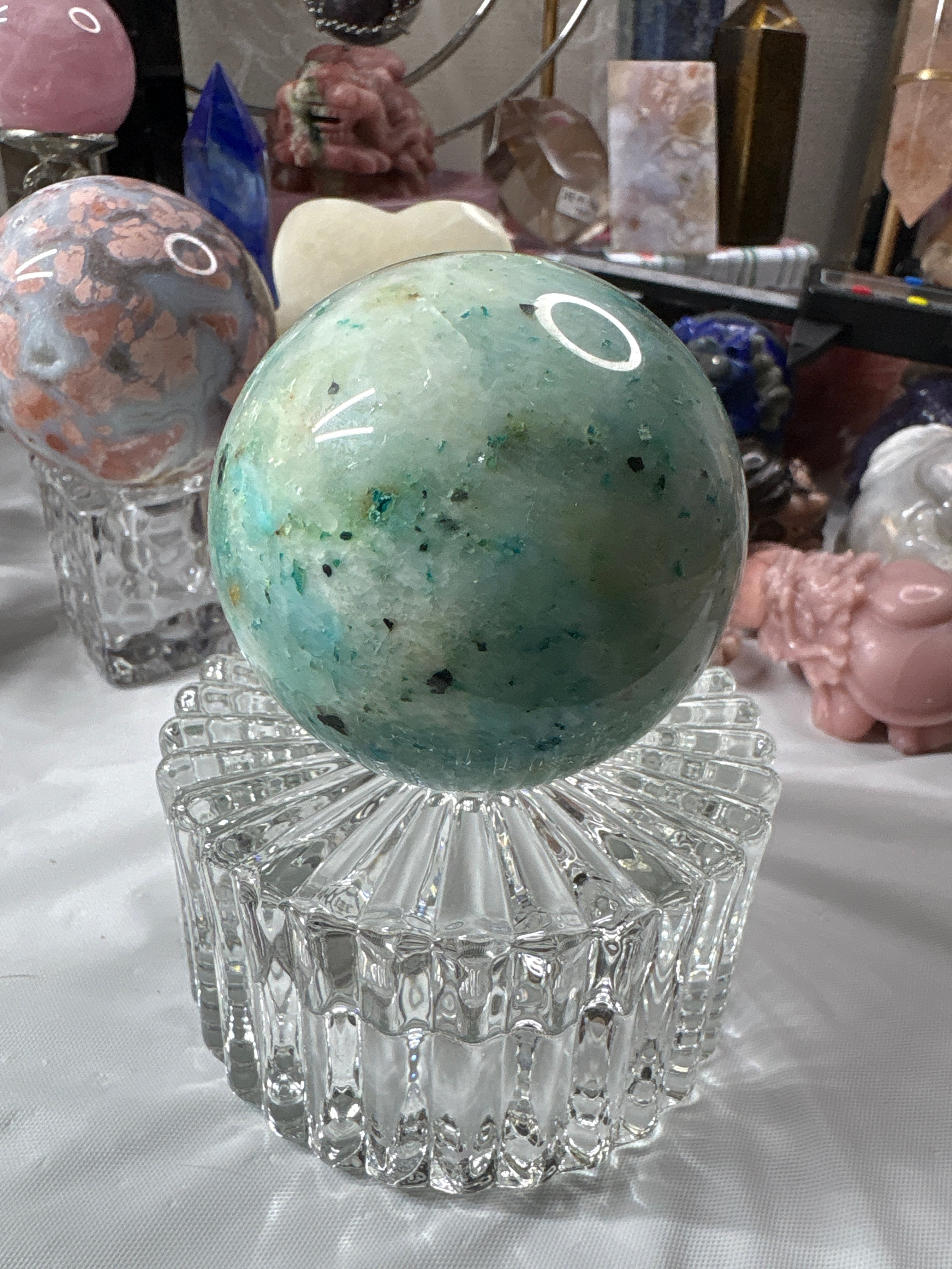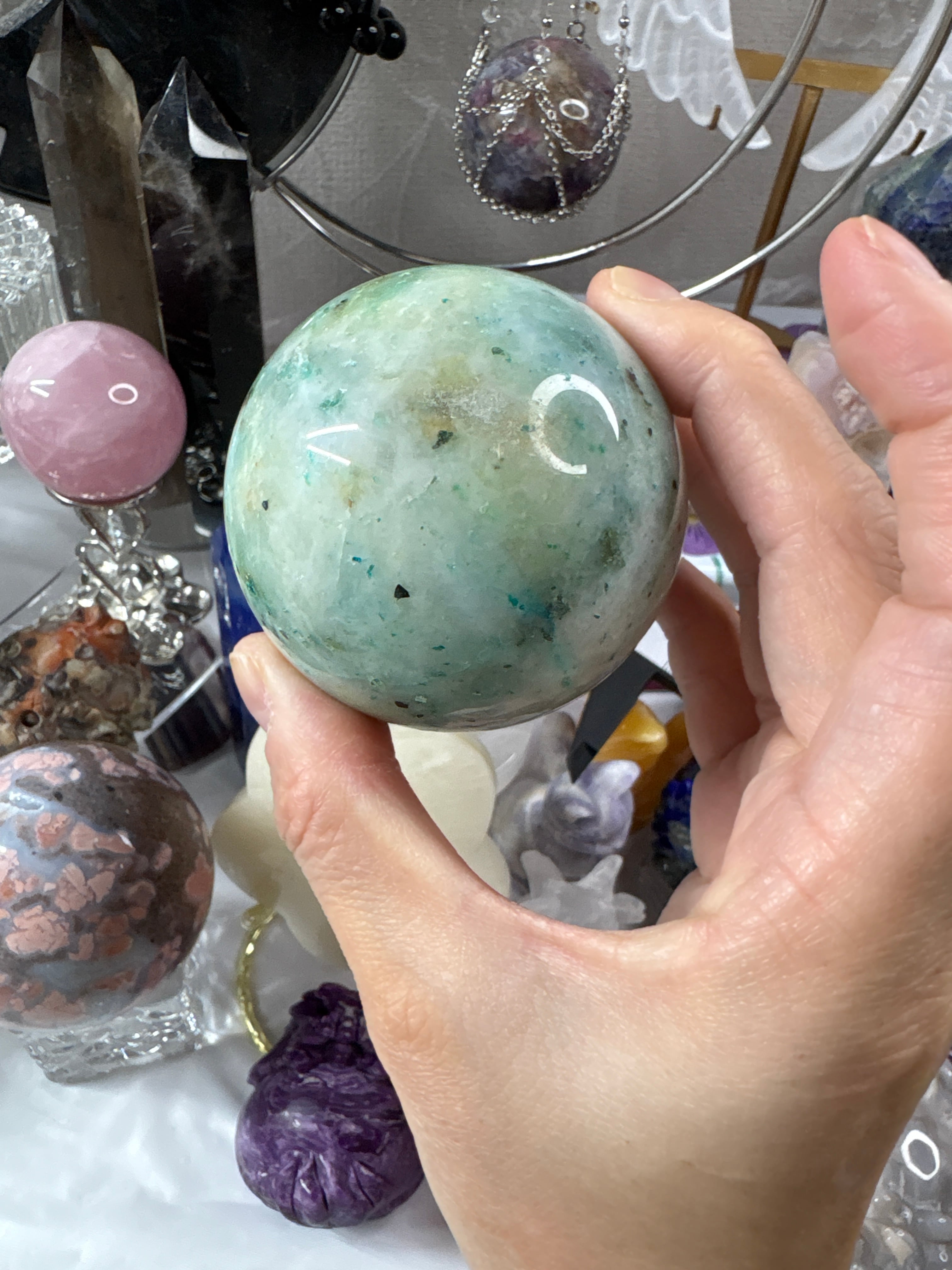 さっちゃんの目利きで選んだ、やさしいブルーグリーンが美しいフェニックスストーンのスフィアです。